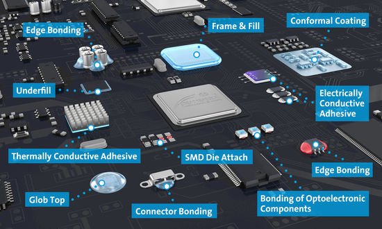 Avec une tendance à la miniaturisation des PCB (circuits imprimés) le défi est de garantir des composants performants et toujours aussi fiables. Beaucoup de soudures sur PCB sont remplacées par des colles conductrices électriques flexibles. Afin de protéger les composants sensibles, les colles sont utilisées en Glop top, en revêtement ou encore underfill pour les puces.