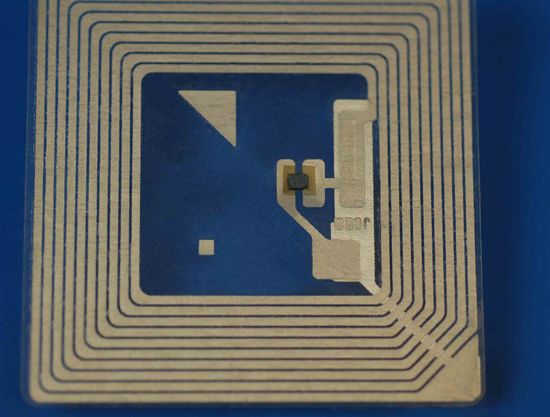 RFID (identification par fréquence radio) sont des systèmes de transmission de données à haute fréquence modernes utilisés pour la traçabilité (tracking tag). Cette nouvelle technologie peut remplacer le code barre encore couramment utilisé.