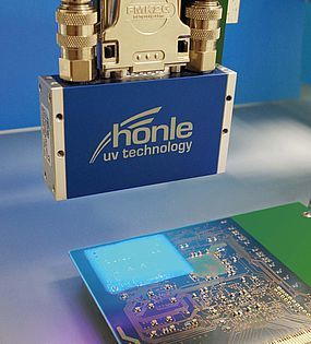 The adhesive can be cured with both UV gas discharge lamps and UV LED lamps. Very good adhesion of applications over a large surface can be achieved with Hönle’s LED Spot 100 at a wavelength of 365 nm.